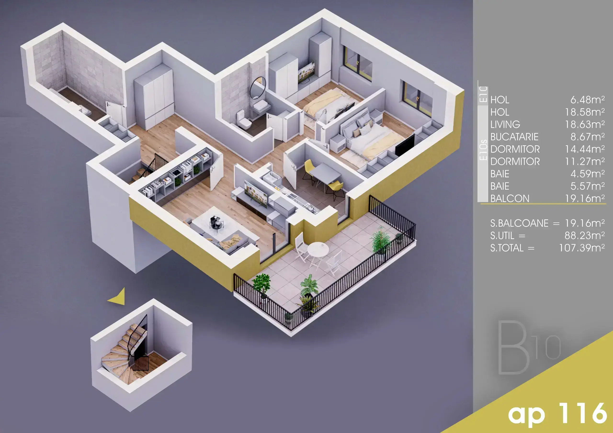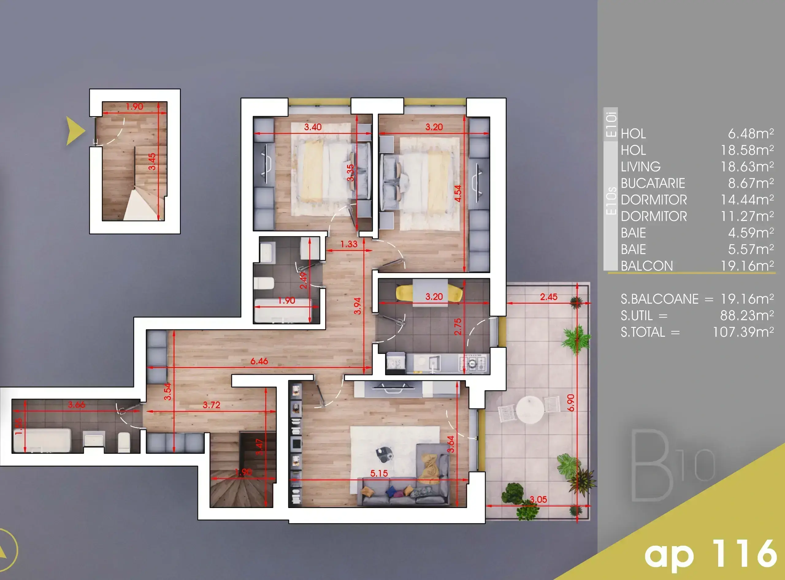 Apartament cu 3 camere 88.23 util interior + balcon 19.16 mp.