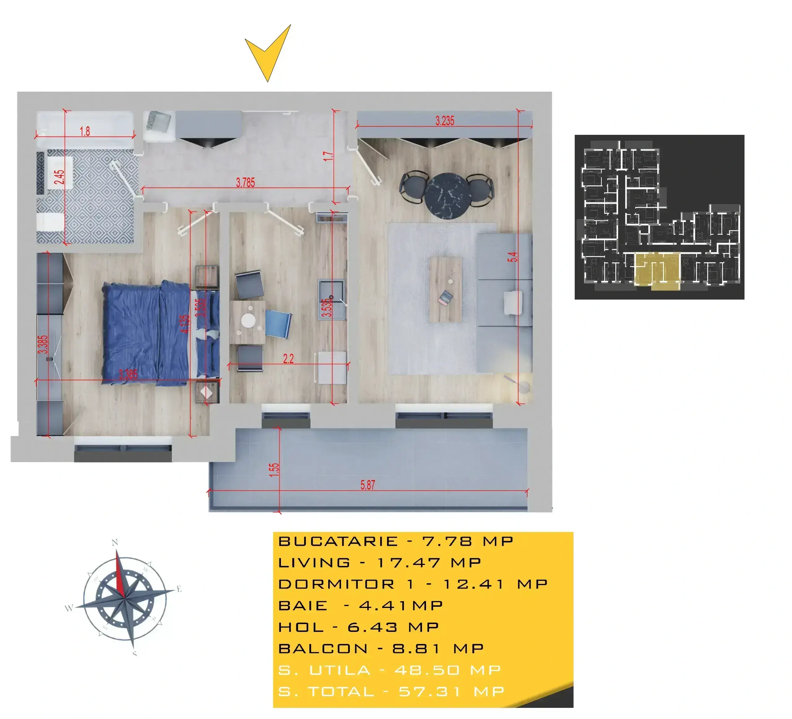 – Suprafata utila 48.50 mp si balcon de 8.81 mp.