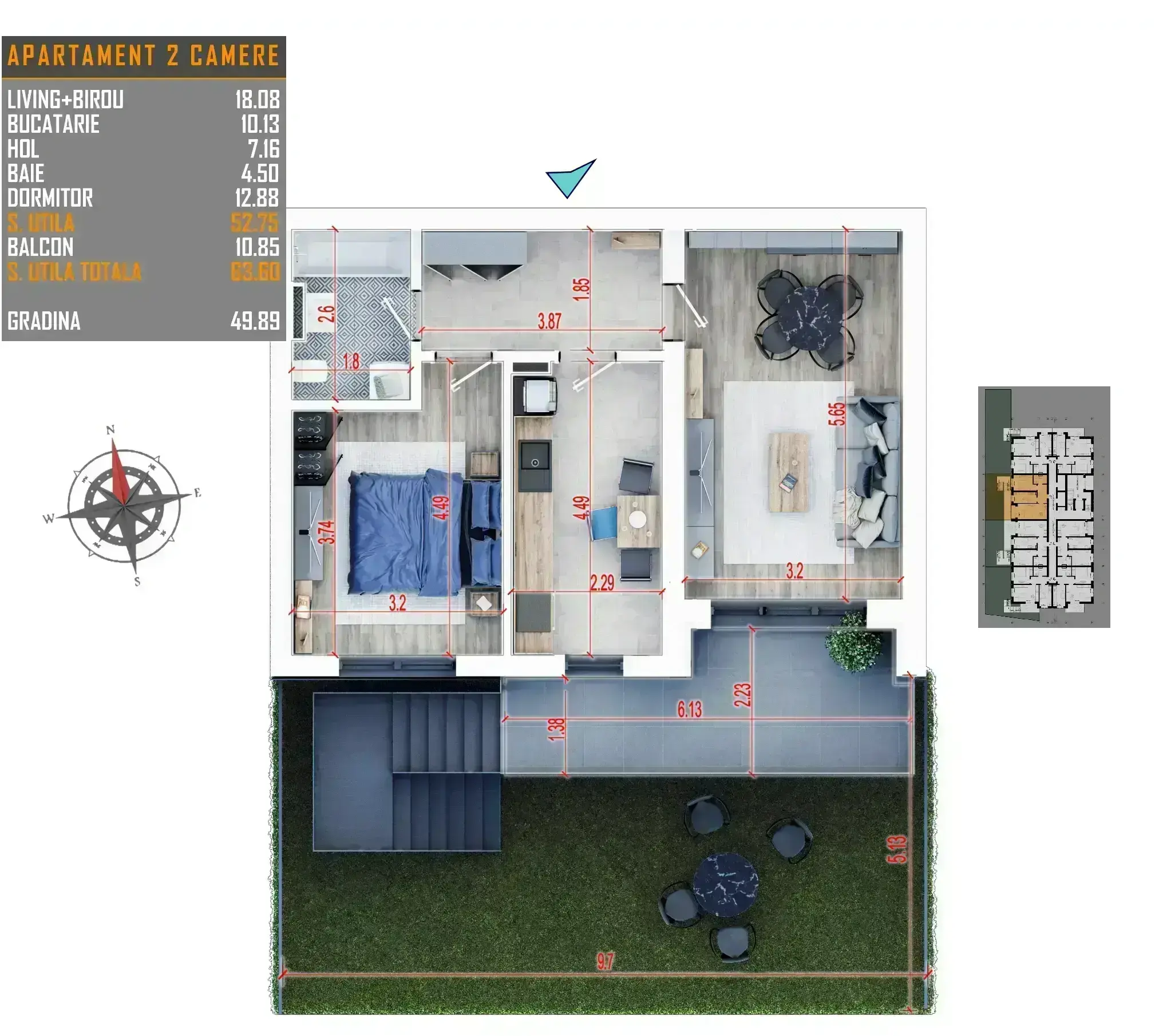 Apartamentul are util interior 52.75 mp + balcon 10.85 mp + gradina 50 mp.