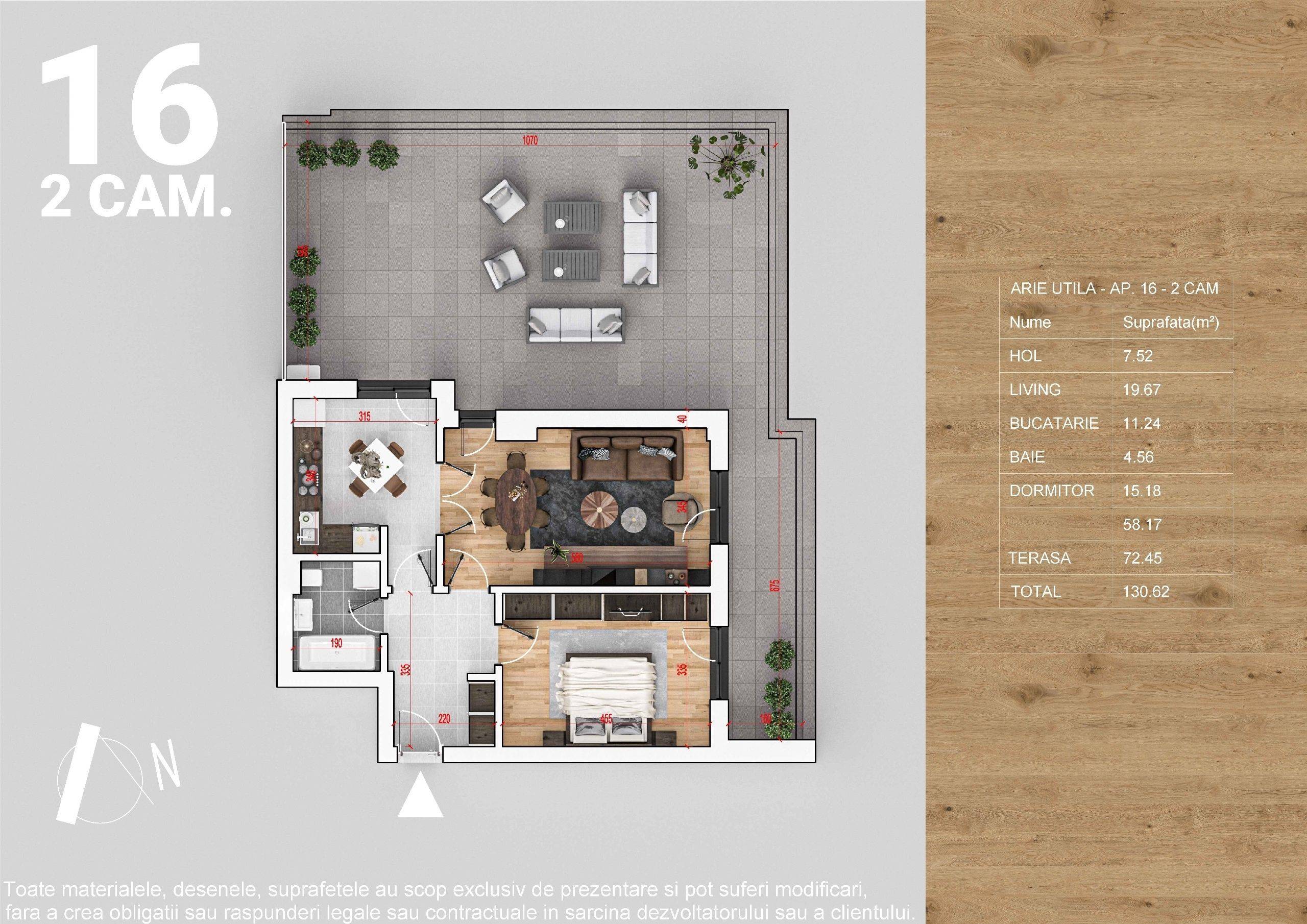 Apartamentul mai include: logie spatioasa, terasa, incalzire in pardoseala, suprafete vitrate mari, obiecte sanitare suspendate, finisaje premium, aspirator centralizat, si aer conditionat.