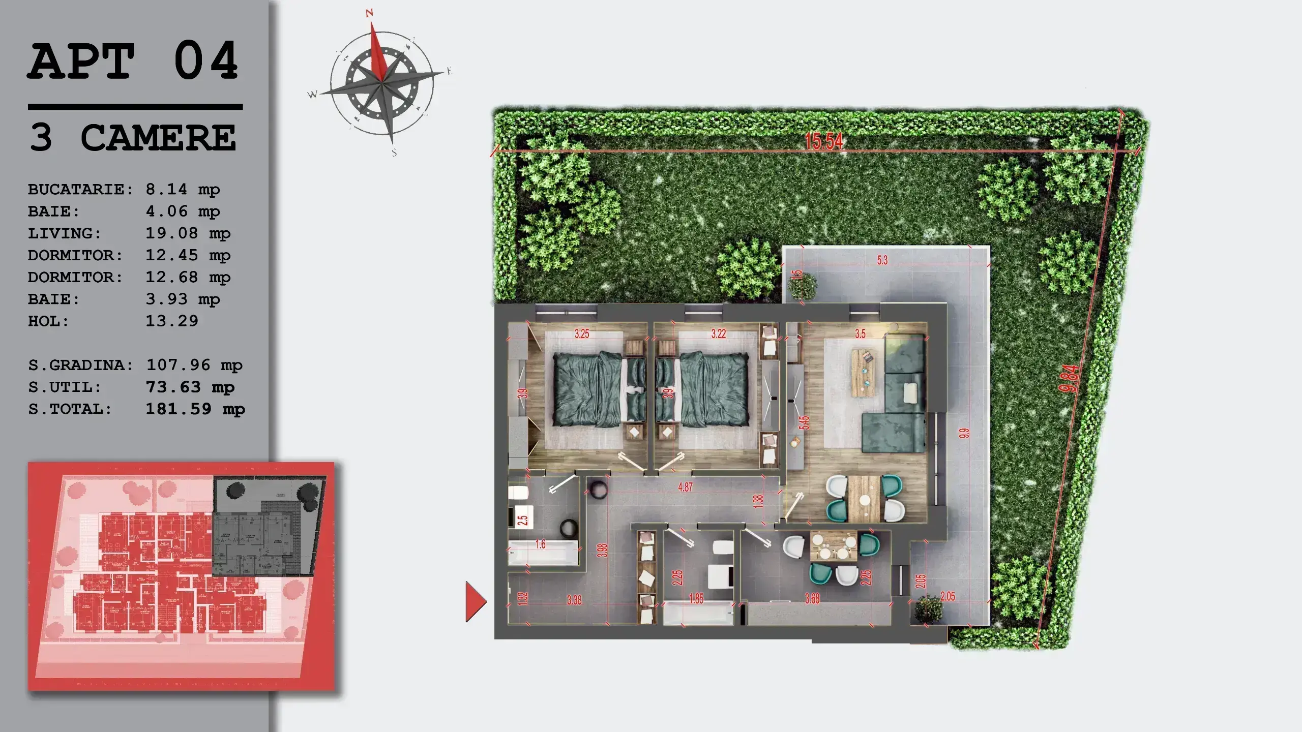 Suprafața totala a apartamentului cu gradina este de 182.59 mp din care suprafata gradinii 107.69 mp.
