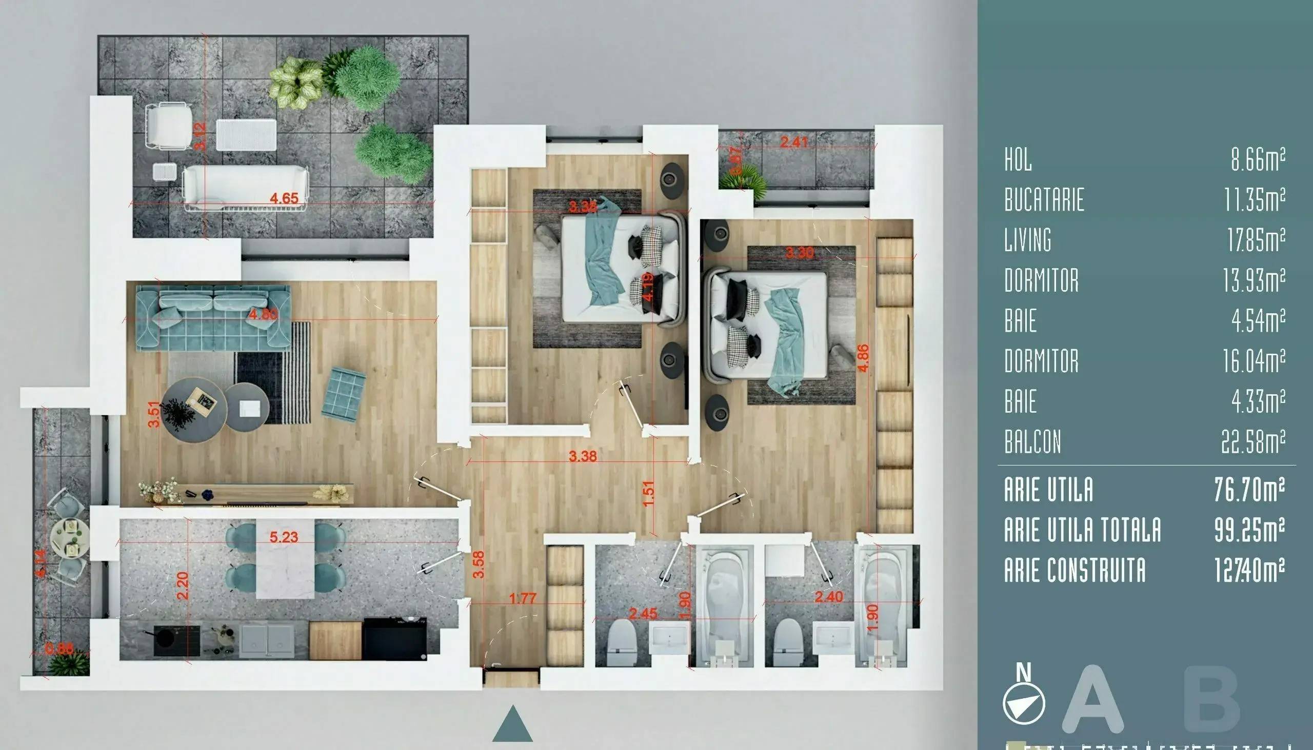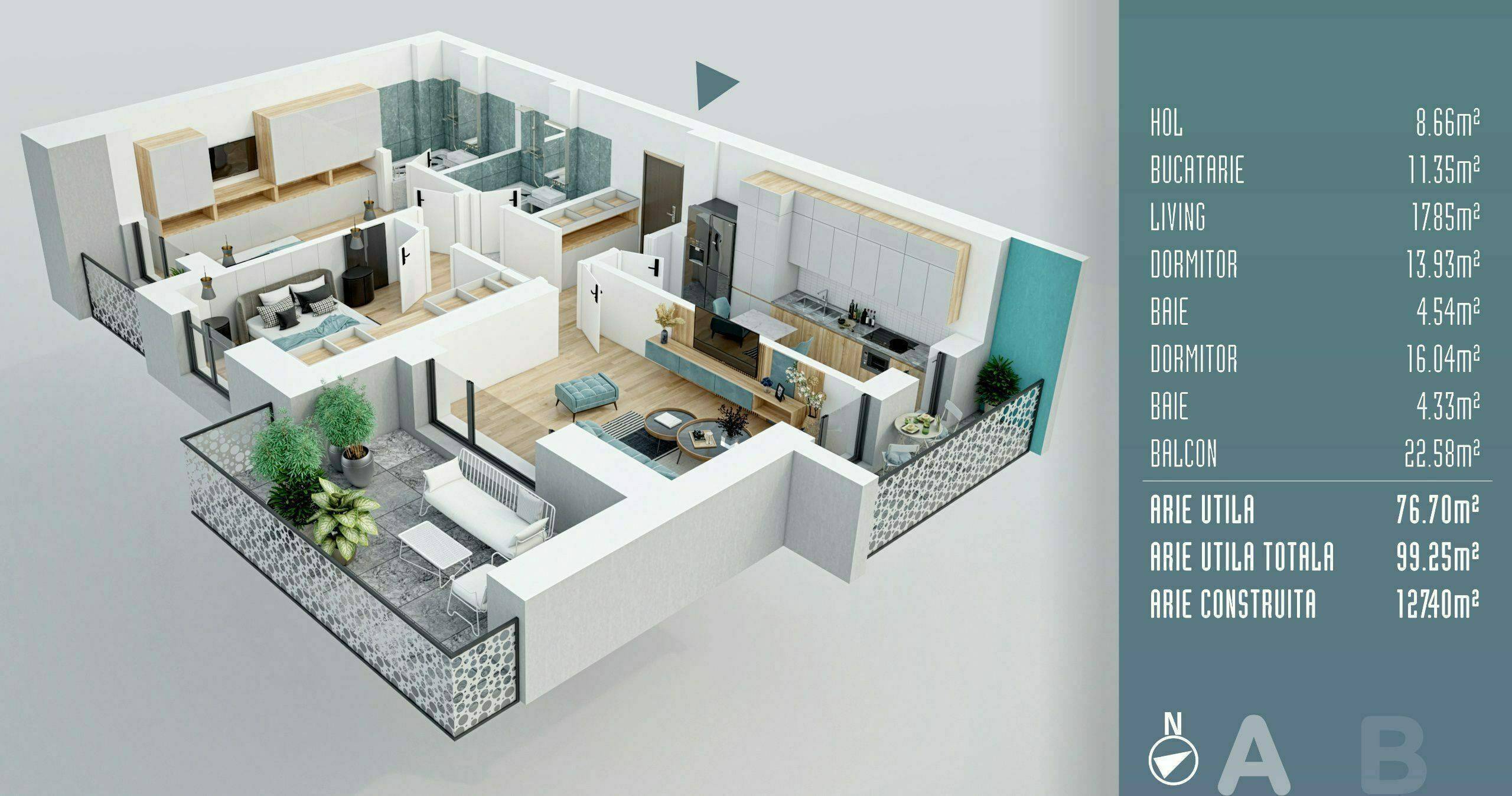 Aceasta proprietate impresionanta ofera 100 mp utili totali din care o terasa spatioasa si partial acoperita avand suprafata de 22.5 mp. Bucataria este inchisa, dormitoarele sunt gandite si pentru un spatii de depozitare generoase iar finisajele sunt de calitate premium ce pot fi personalizate la alegere.