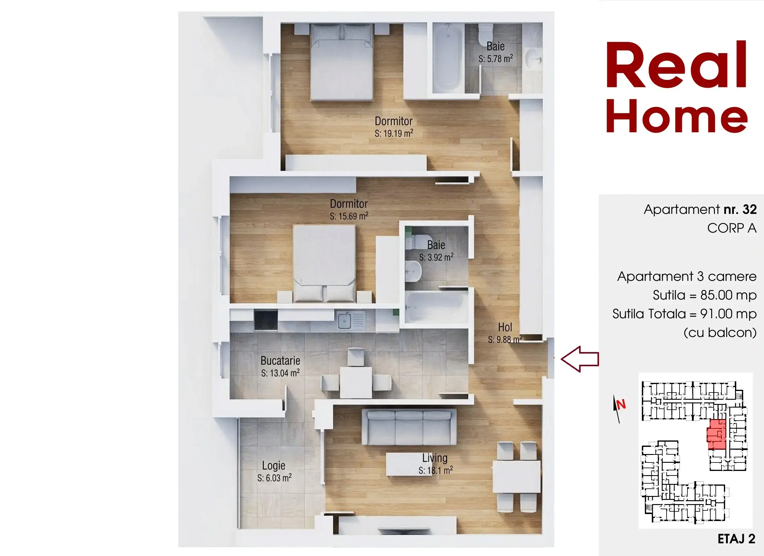 Apartament 3 camere : util interior 84.99 + logie 6.03 mp.