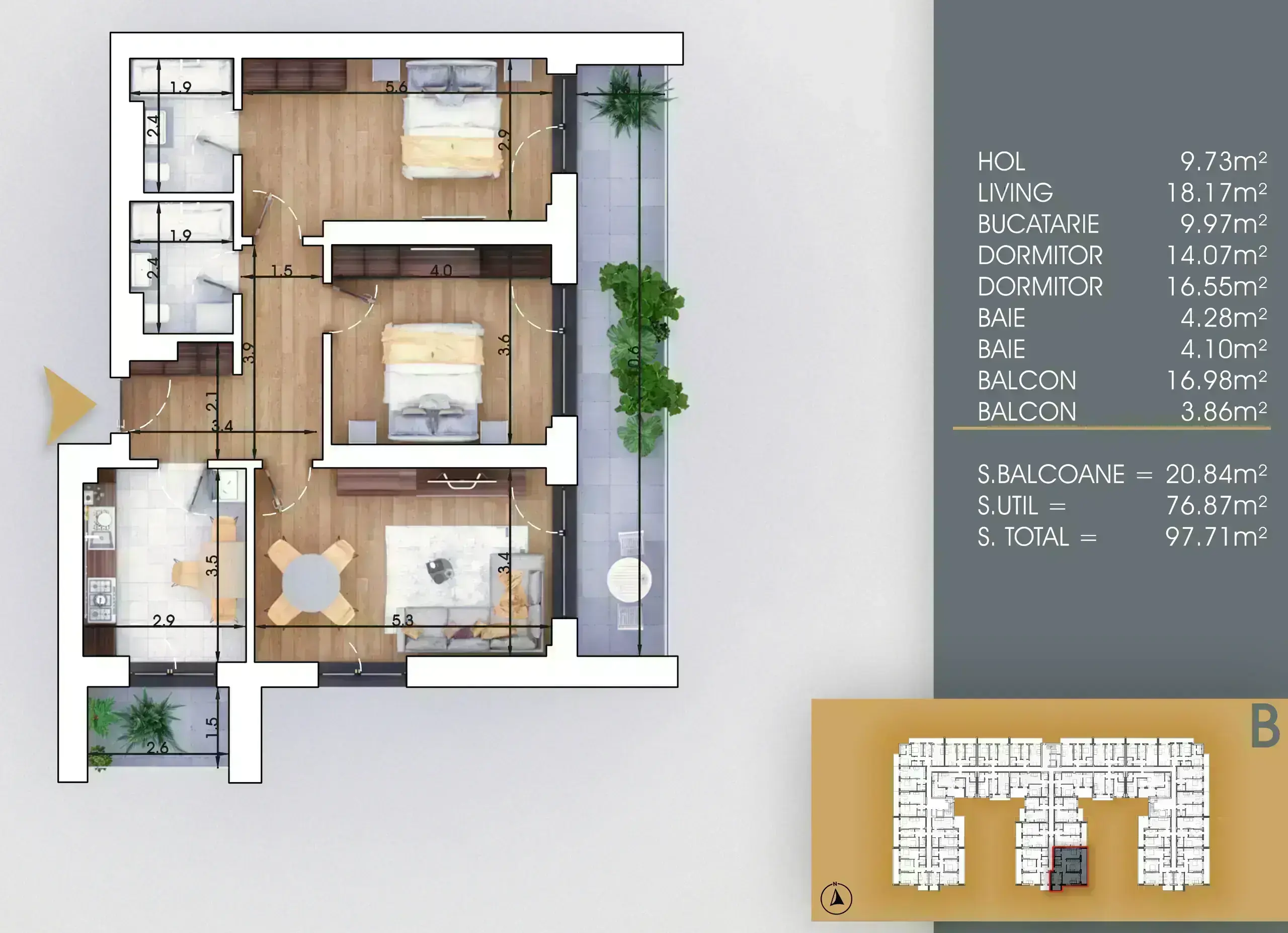 Suprafata generoasa de 97.71 mp totali din care terase de 20.84 mp cu iesire din fiecare camera. Disponibilitatea acestui tip de apartament este la diferite etaje ale proeictului de 12 niveluri.