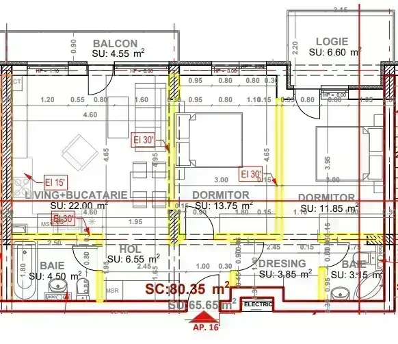 Apartament de 3 camere cu suprafata utila 70.40 mp + doua balcoane 9.05 mp.