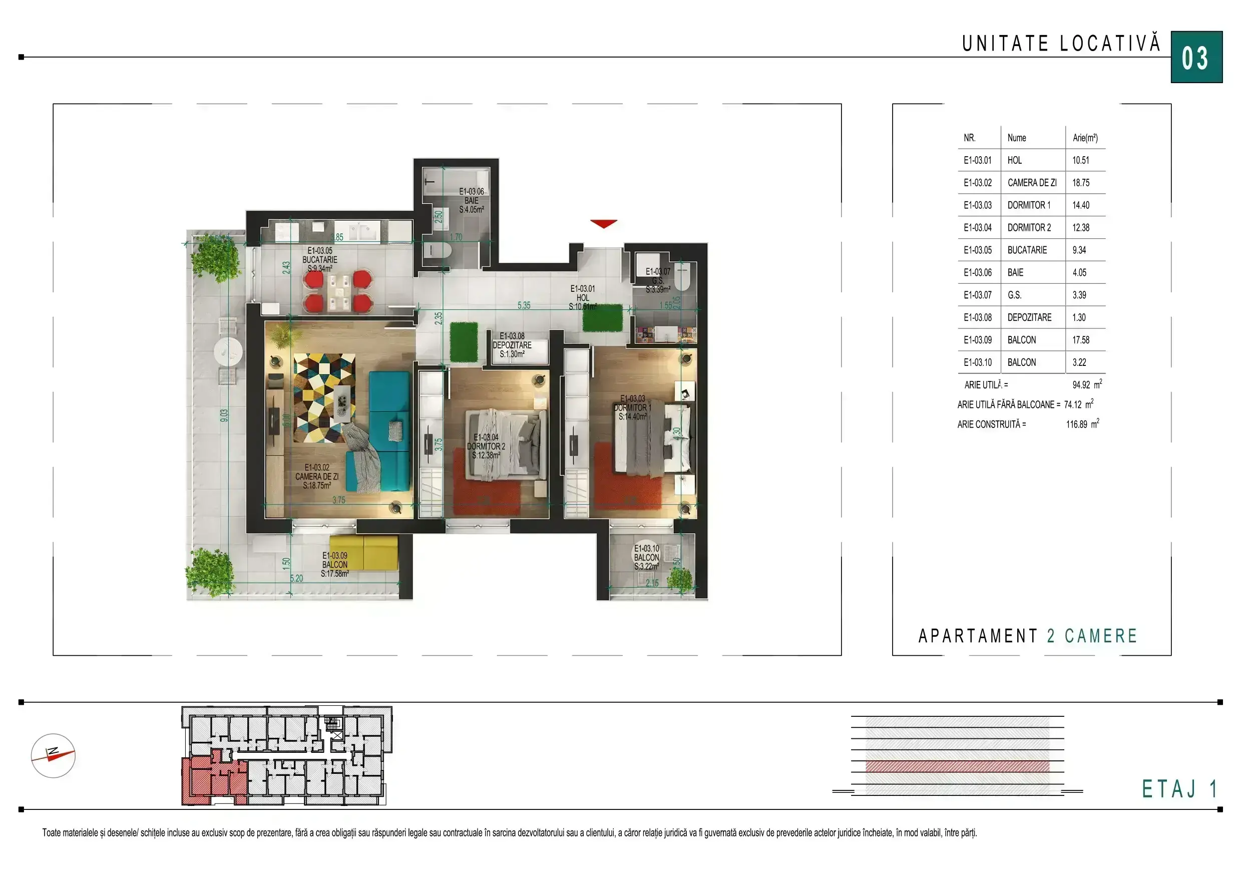 Apartamentul dispune de suprafata utila interioara 74.48 mp + balcon de la 20.04 mp.