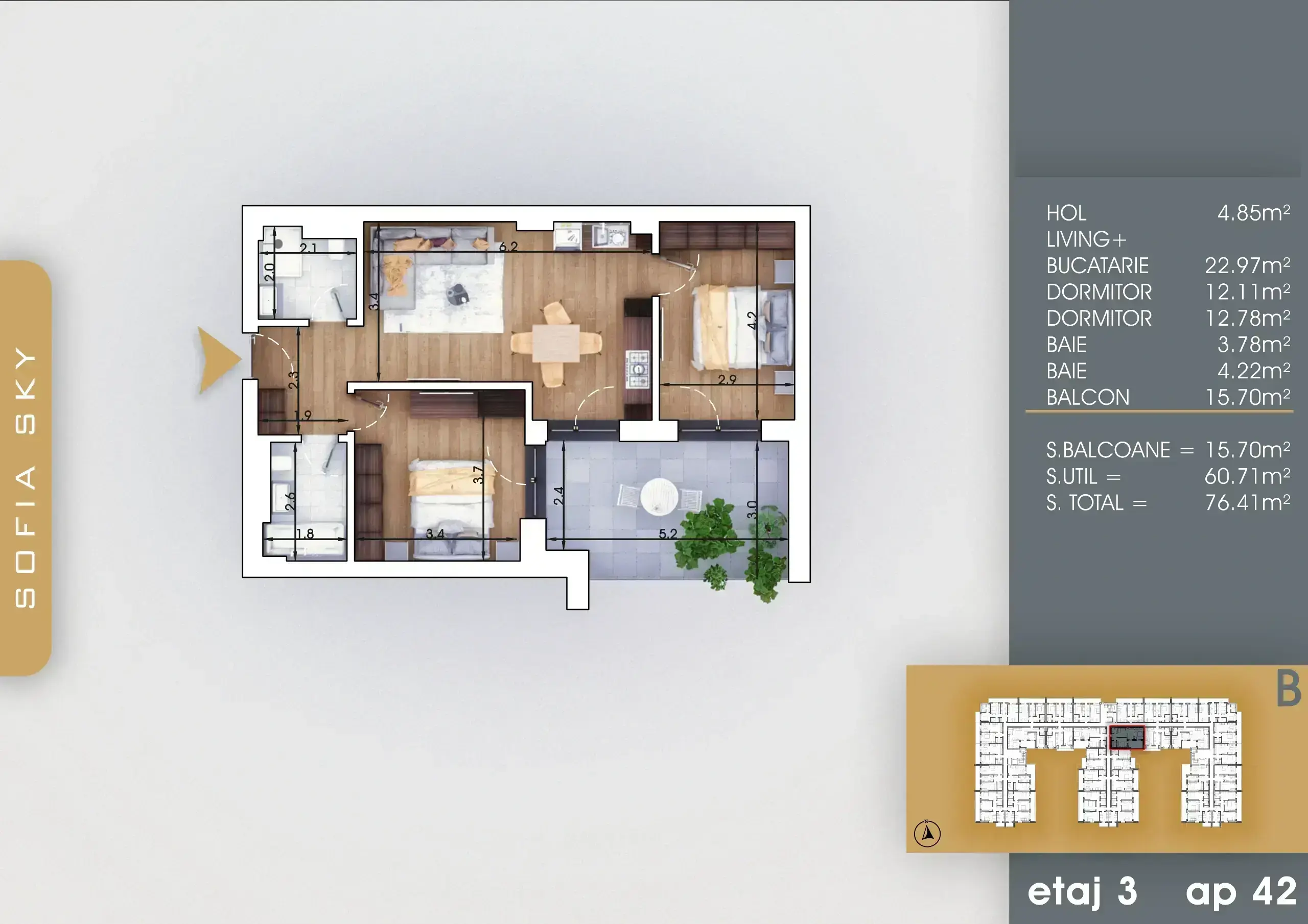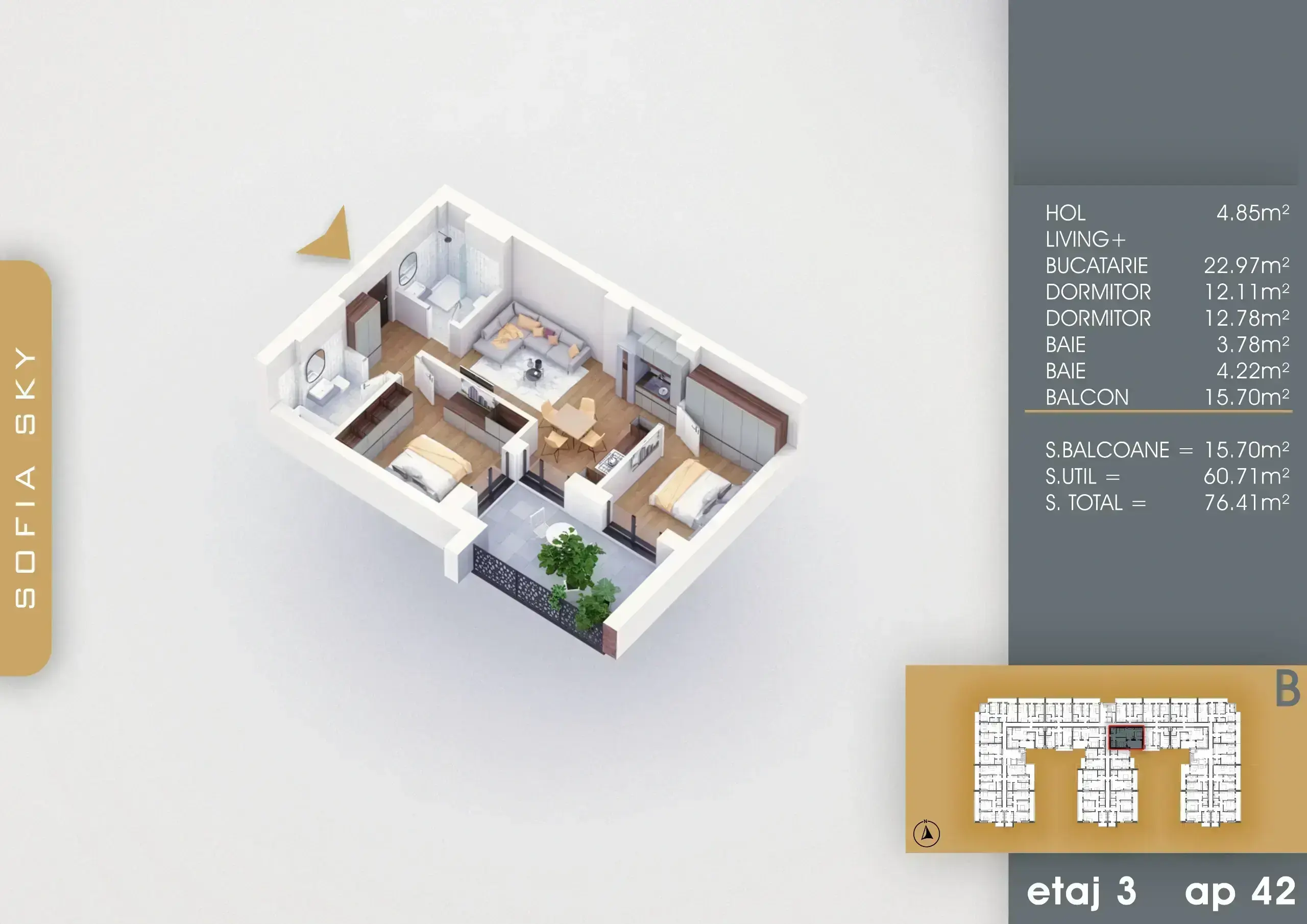Acest apartament spațios de 3 camere situat în cadrul proiectului Sofia Sky oferă un spațiu util de 61 mp și o suprafață totală de 77 mp, incluzând terasa generoasa. Designul modern și facilitățile de ultimă generație creează un mediu ideal pentru familii și cei care doresc un stil de viață confortabil și elegant.