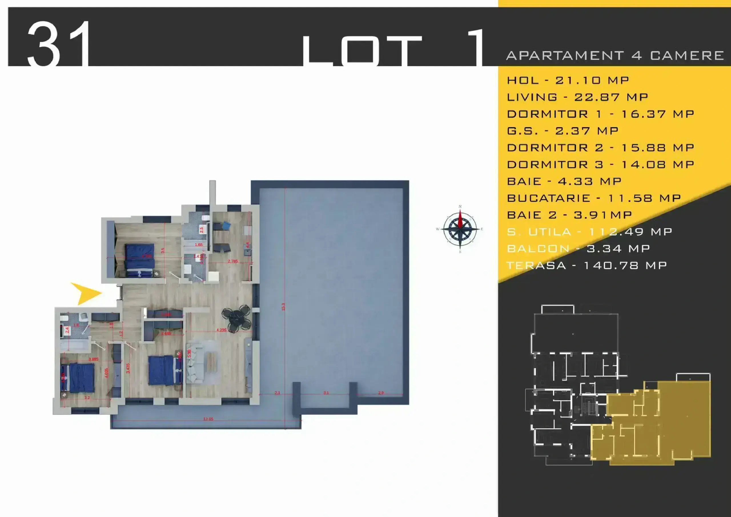 Situat in proximitatea metroului si a zonelor de market din estul capitalei , va oferim apartament cu – Suprafata utila interioara 113.19 mp + terasa 144.12 mp.