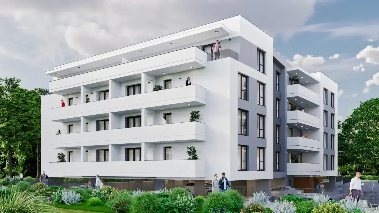 • Spații comune amenajate cu alei pietonale, spații verzi și iluminat ambiental.