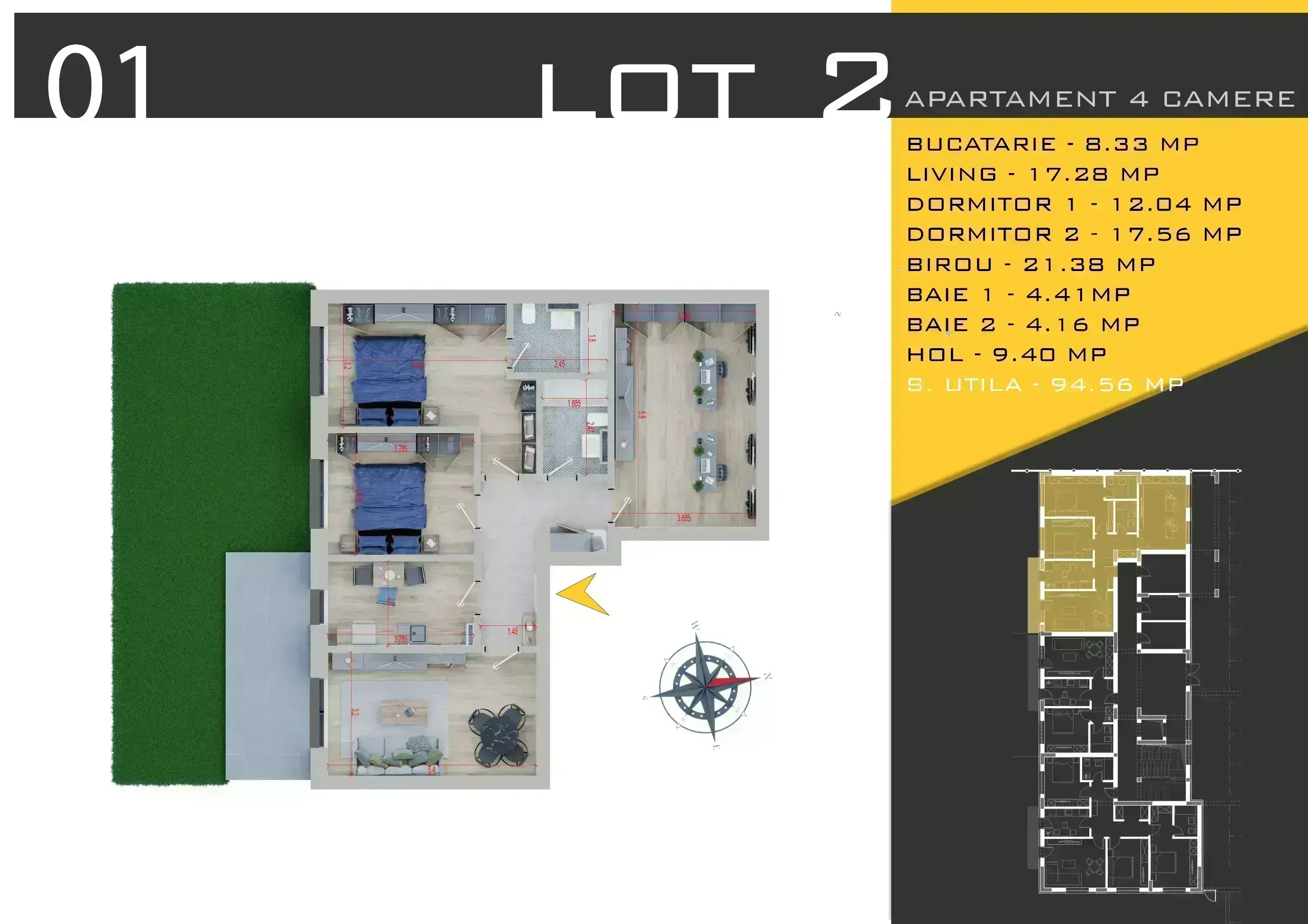 Apartament de 4 camere cu gradina proprie, care oferă o suprafată generoasă de 94.56 mp, la care se adauga o gradina spectaculoasa cu orintare sud de 63.79 mp. Proiect nou in zona Pallady, cu standard inalt de constuire si finisaje premium.