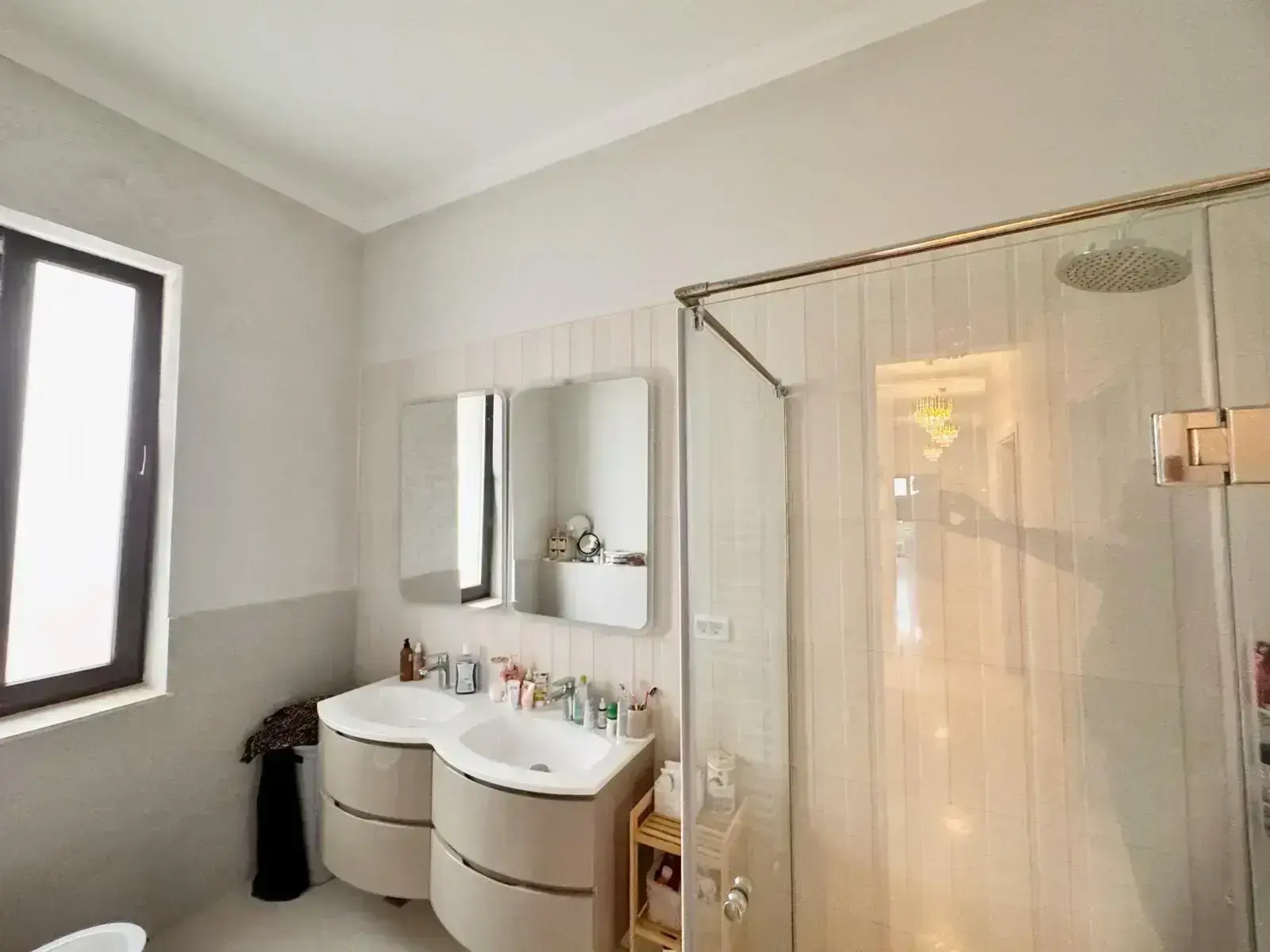 Dispune de 3 bai , 3 camere , camera birou , dressing, camera tehnica , bucatarie mare 19 mp , terasa exterioara , boxa .