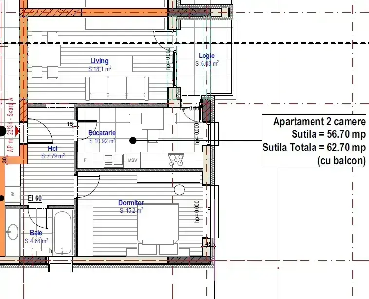 * Suprafață: 57 mp utili